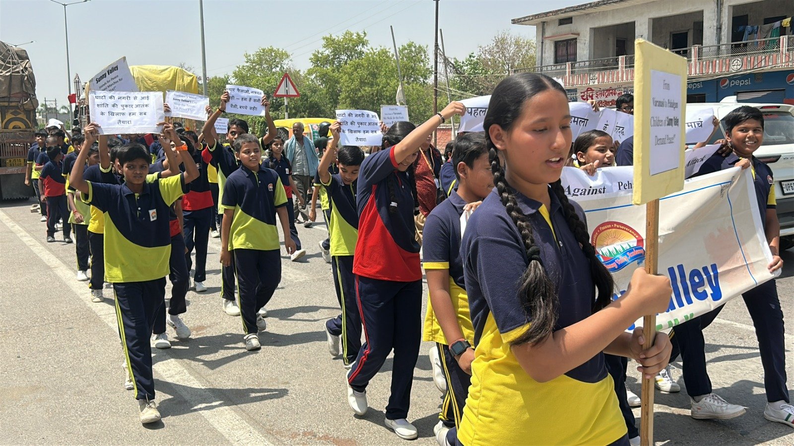 “हम शांति चाहते हैं, हिंसा नहीं” और “मासूम जिंदगी मायने रखती है” लिखे बैनर लेकर बच्चों ने पीड़ितों और उनके परिवारों के साथ एकजुटता व्यक्त की। मार्च में अंग्रेजी और हिंदी दोनों में नारे लगाए गए, जिसमें “हम बच्चे हैं सनी वैली के, आतंकवाद के खिलाफ कदम एकता के!” जैसे दिल को छू लेने वाले नारे शामिल थे। और “वी आर सनी वैलियन वी चूज पीस ओवर फीयर “